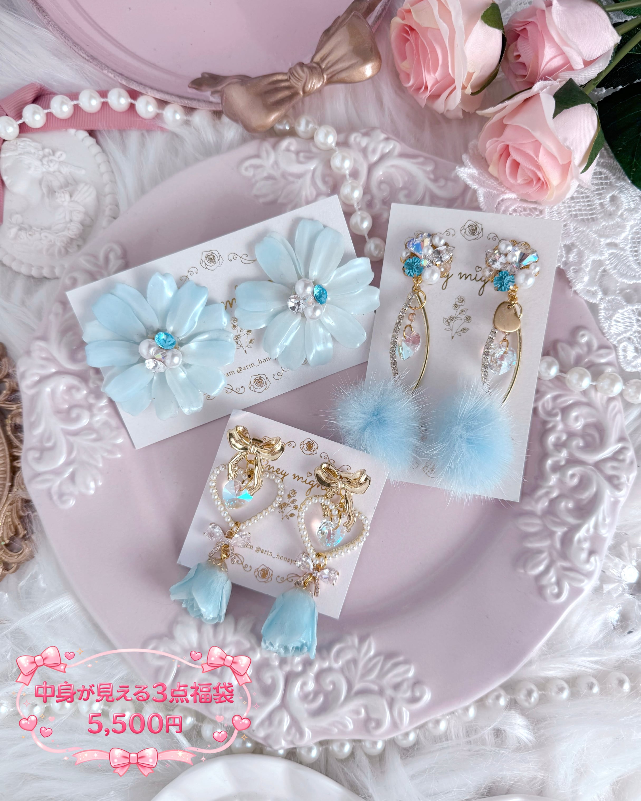 【ピアス】♡中身が見える福袋3点セット【ブルー×ガーリー】 ♡ / Visible Item Lucky Bag – 3-Piece Pierced Earrings Set