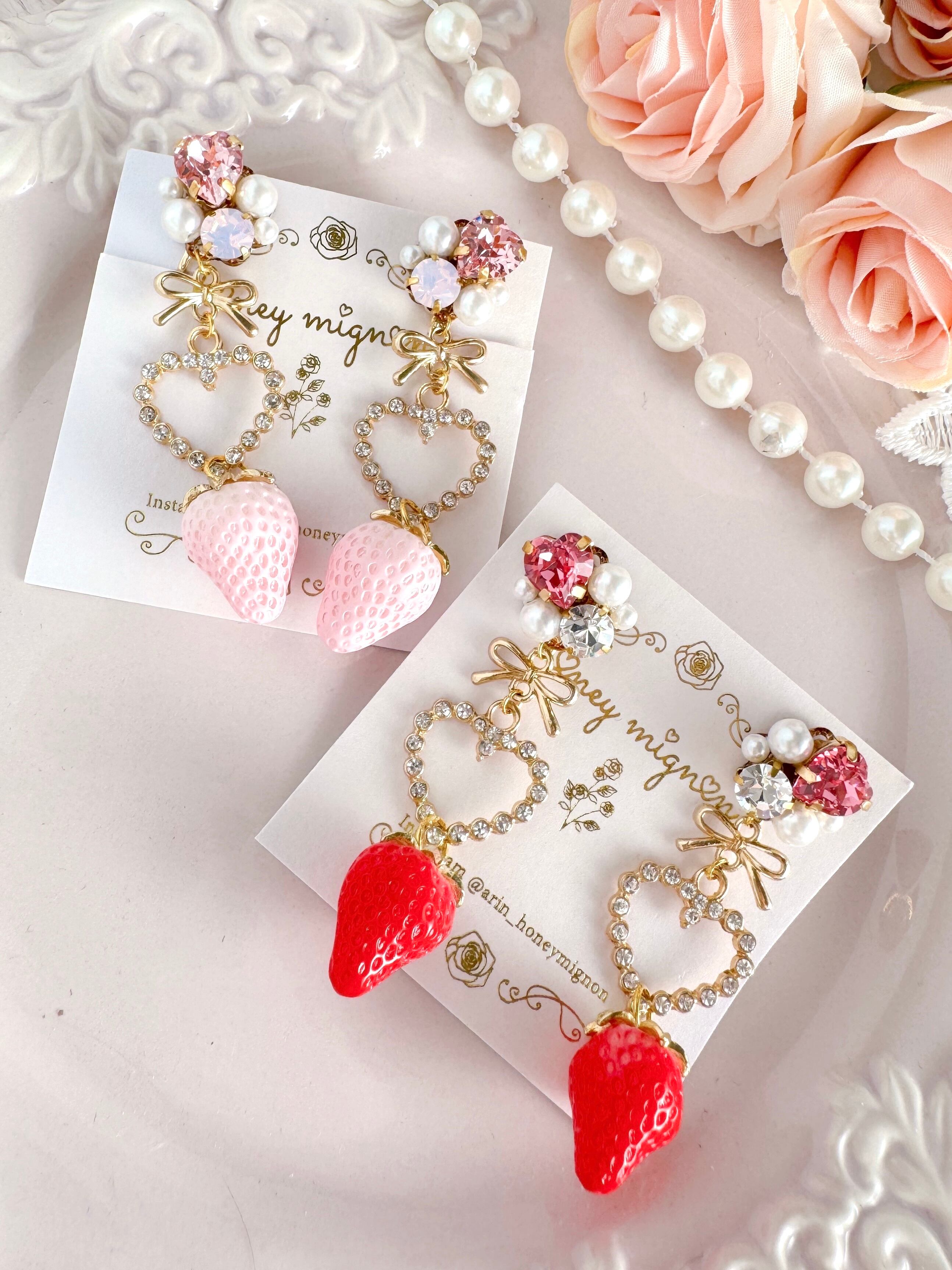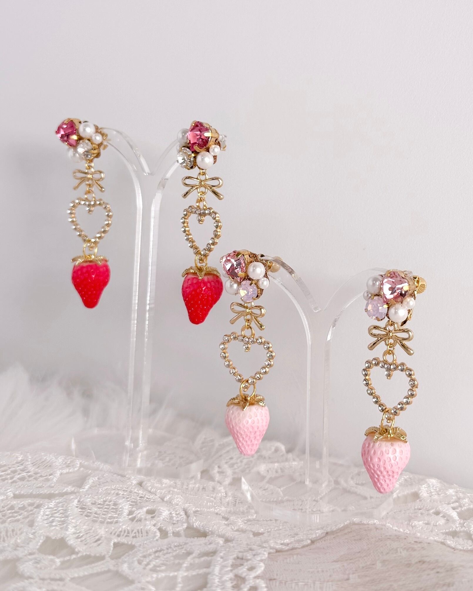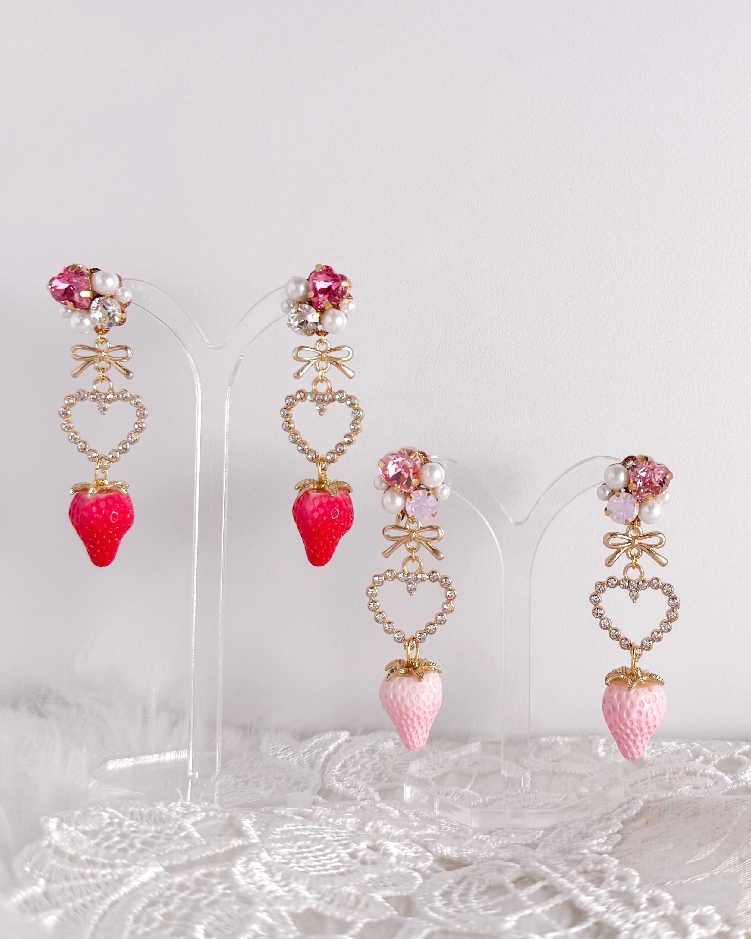 ころんと可愛らしい、リアルないちごモチーフに、ハートパーツときらめくビジューを添えた耳元アクセサリー。