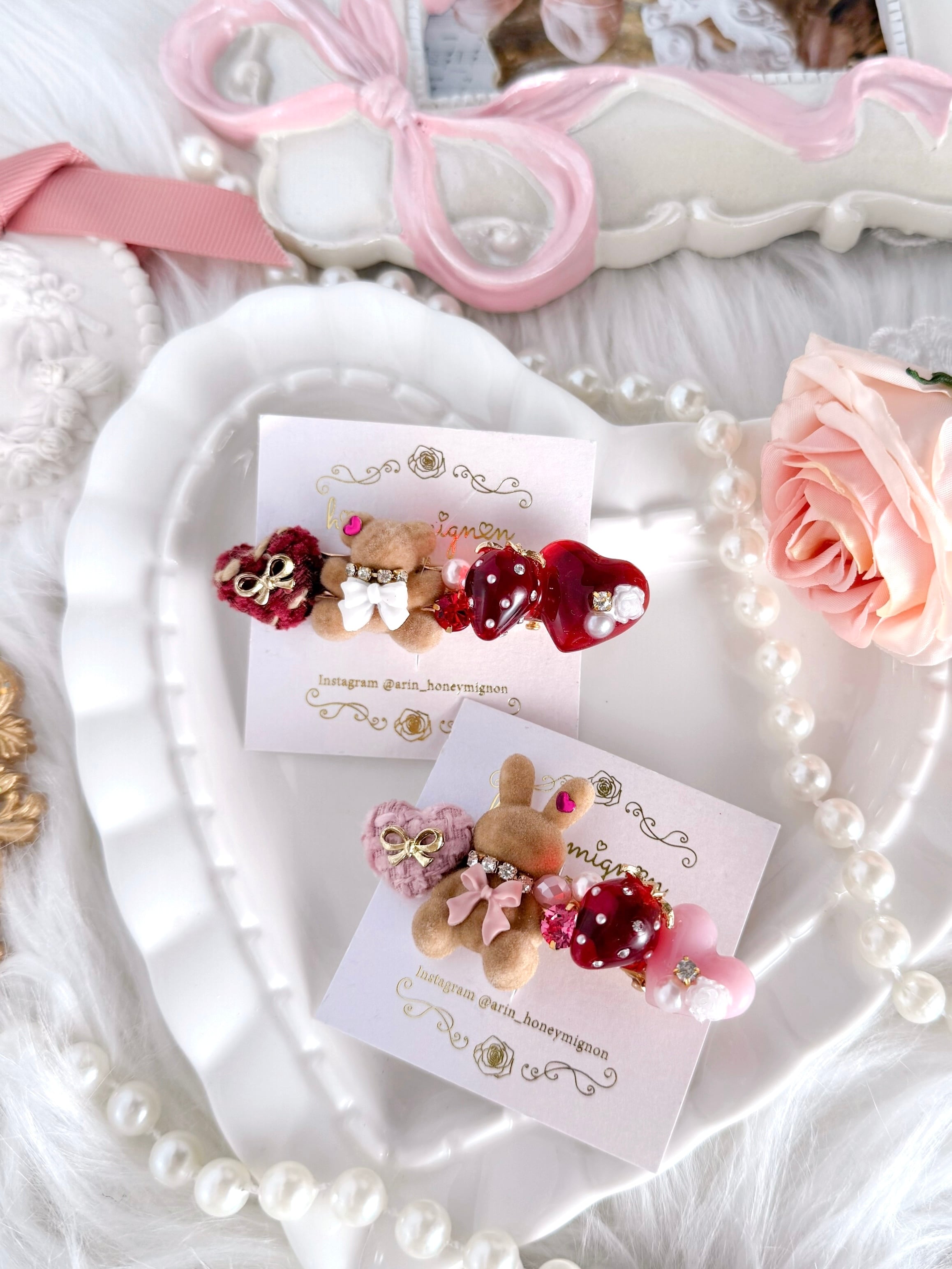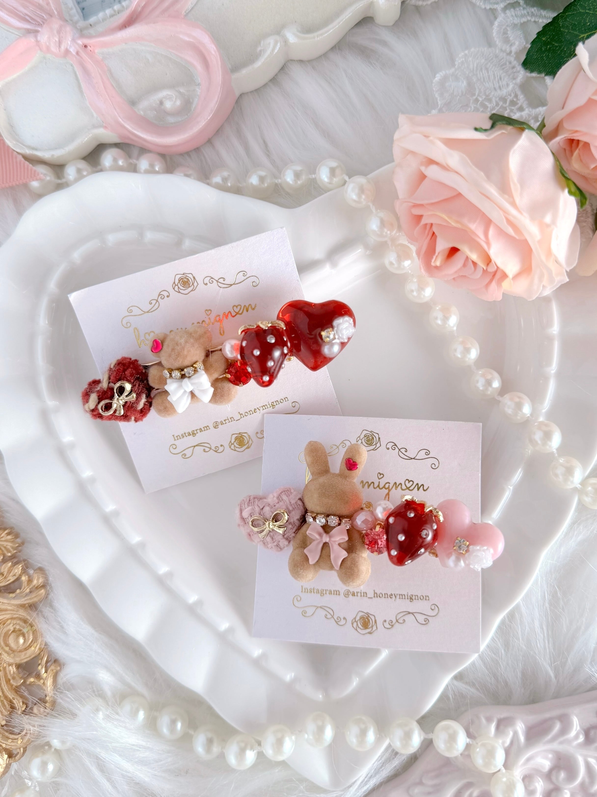 もこもことしたアニマルモチーフに、キラキラいちごやハートを添えたヘアクリップ。