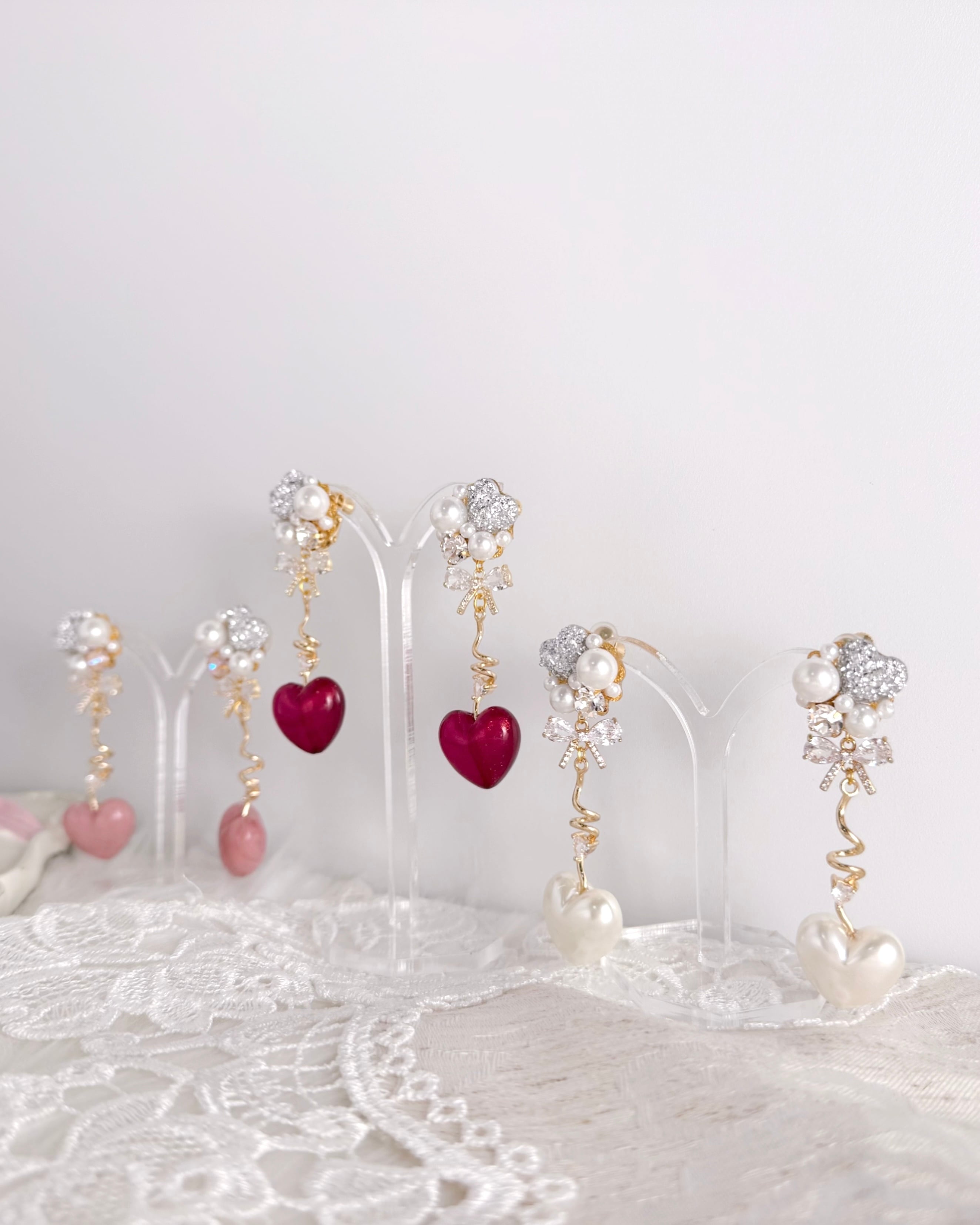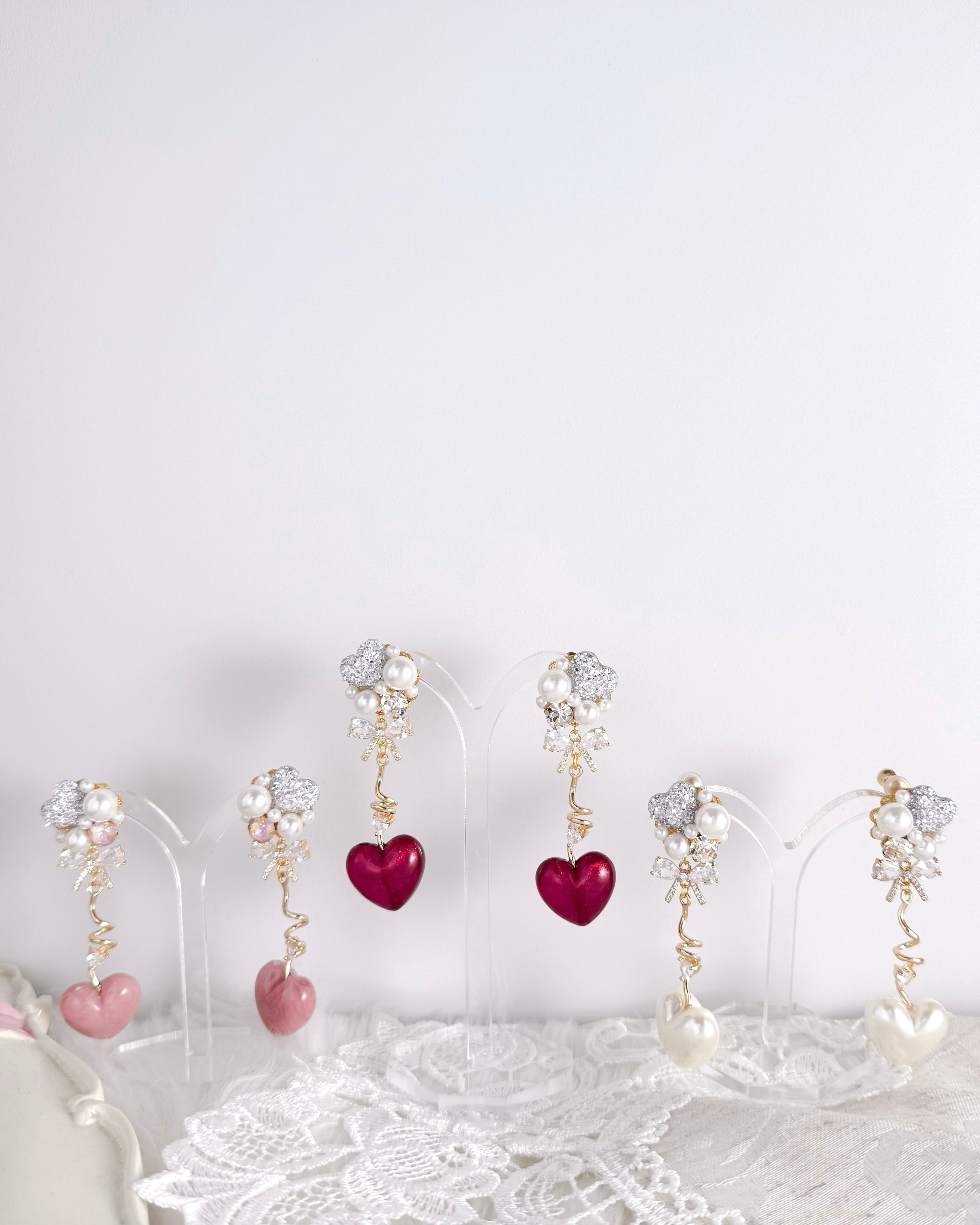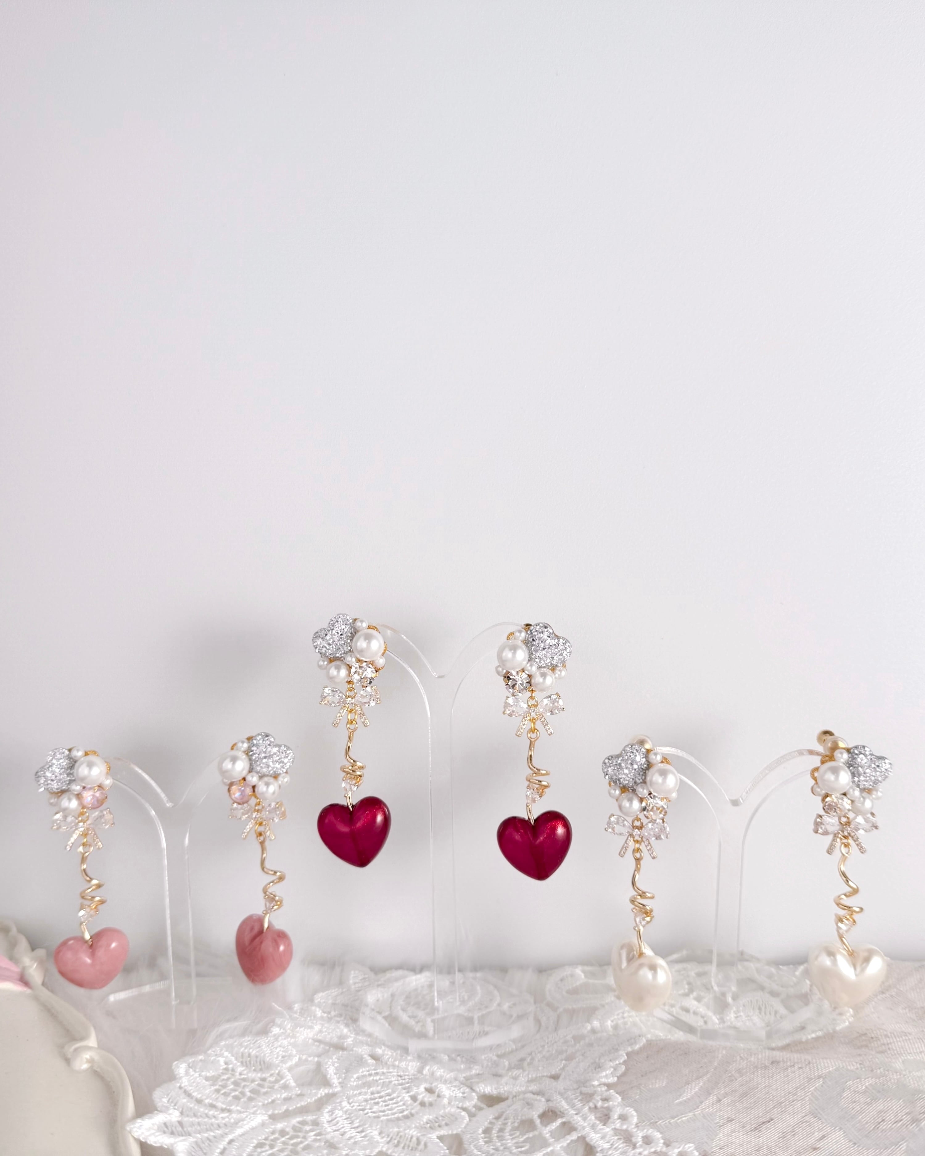 ちゅるんとした艶のあるハートパーツに、パールを添えた上品な耳元アクセサリー。