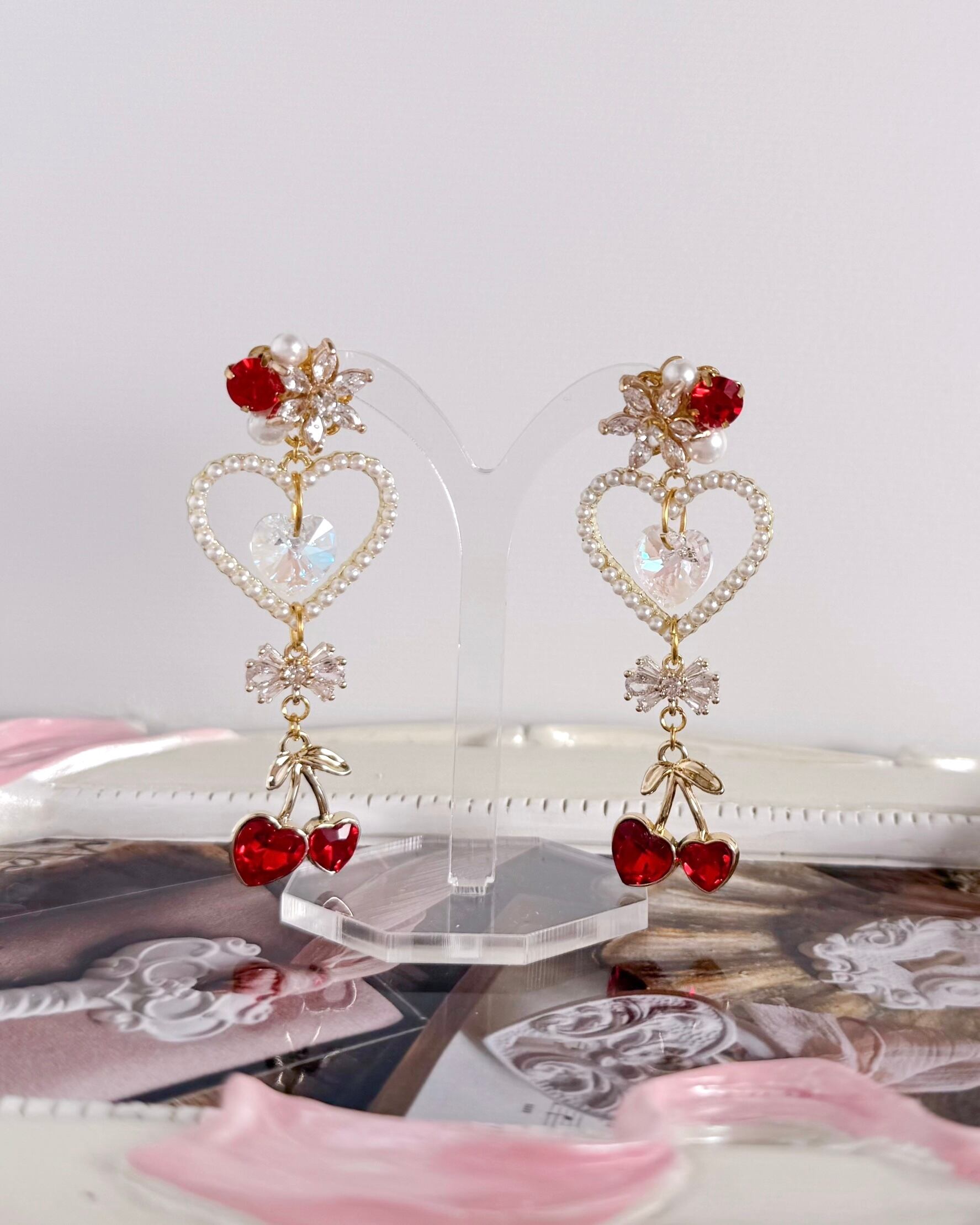 パールで縁取られたハートモチーフに、きらめくさくらんぼを添えた耳元アクセサリー。