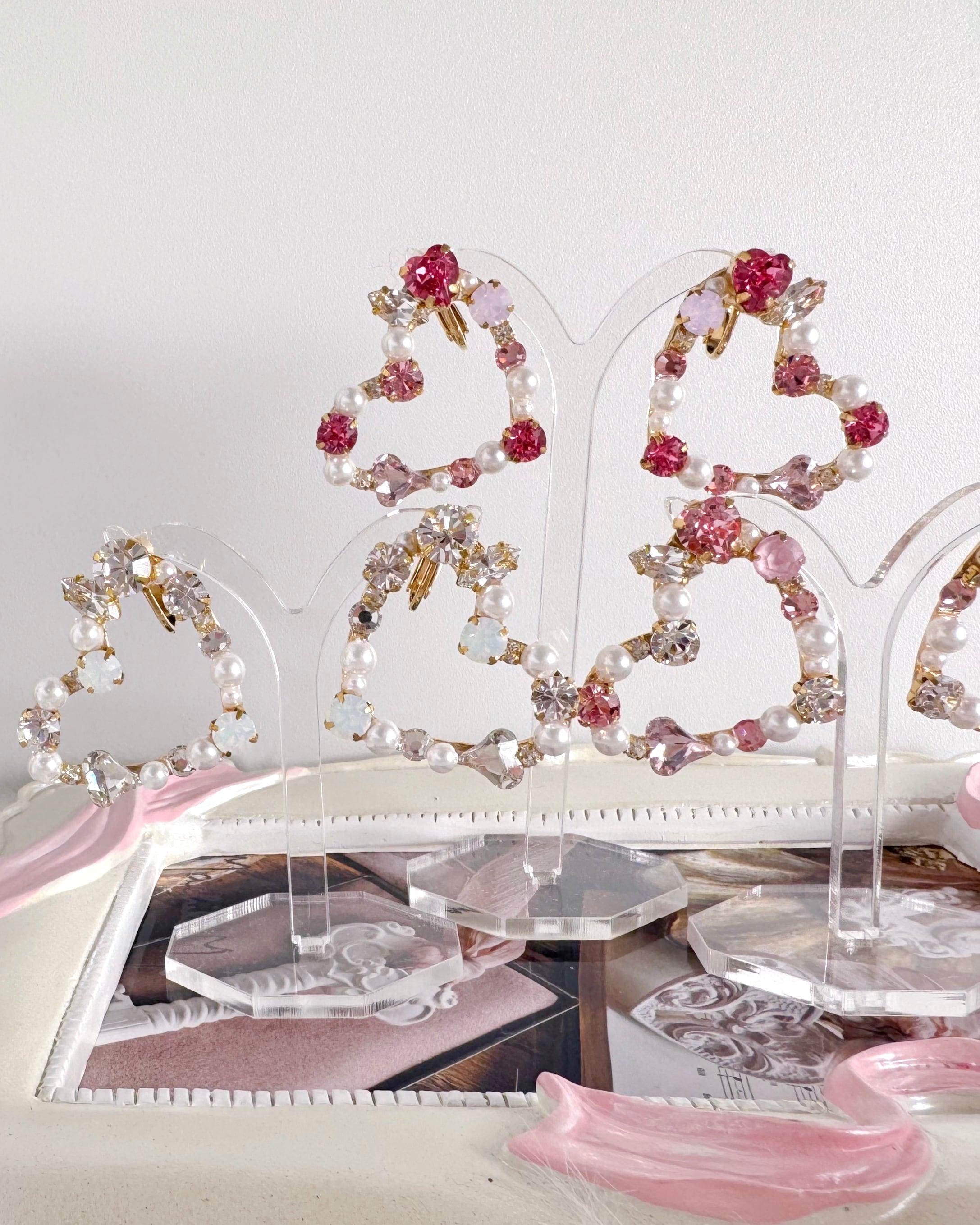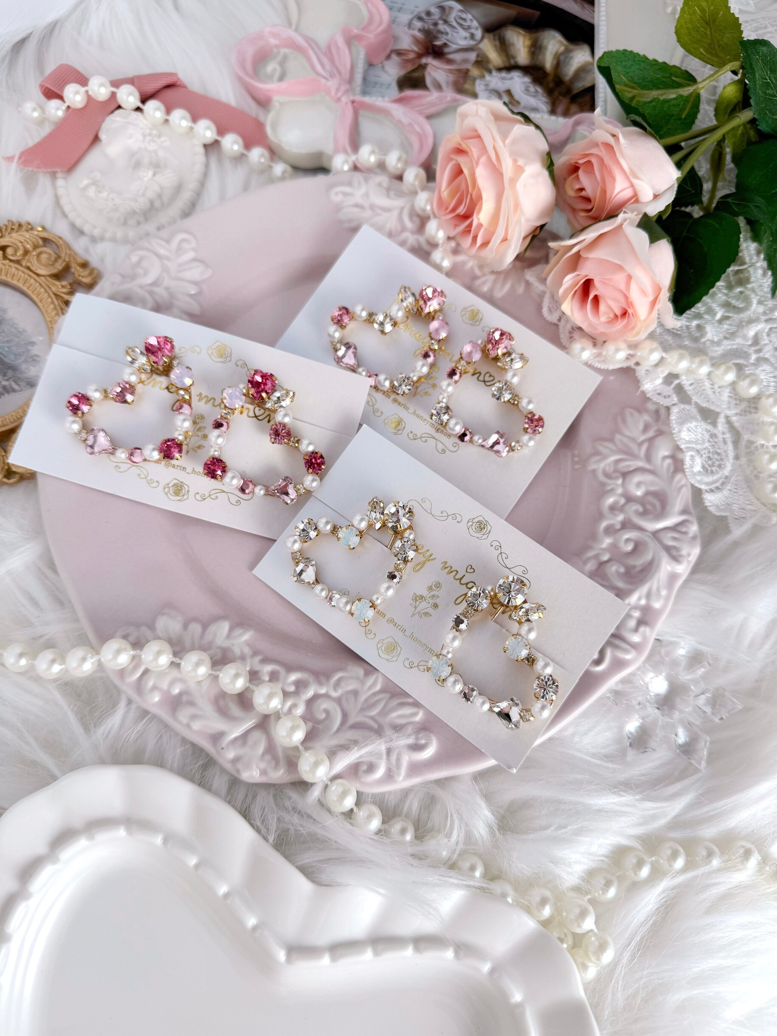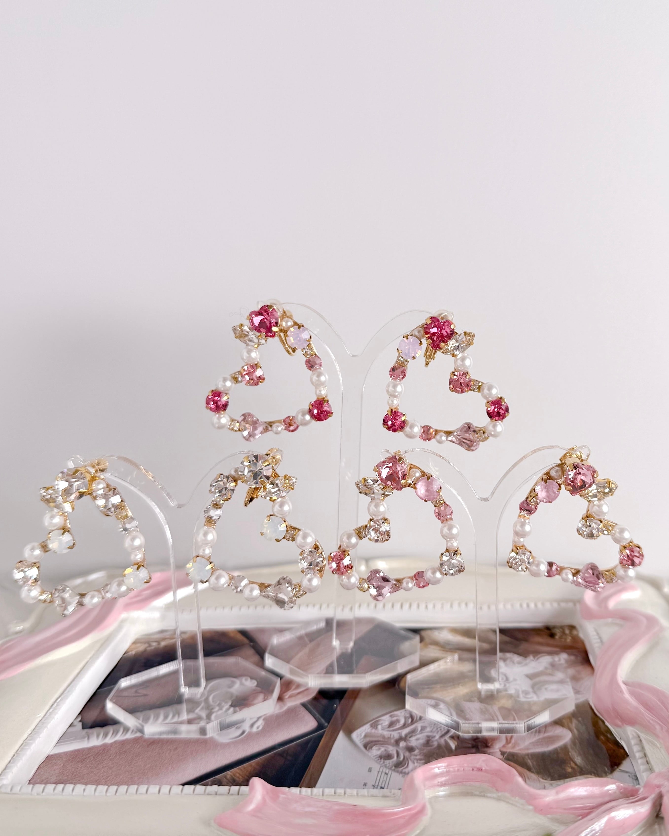 パールとビジューで縁取った、繊細なハートフレームの耳元アクセサリー。