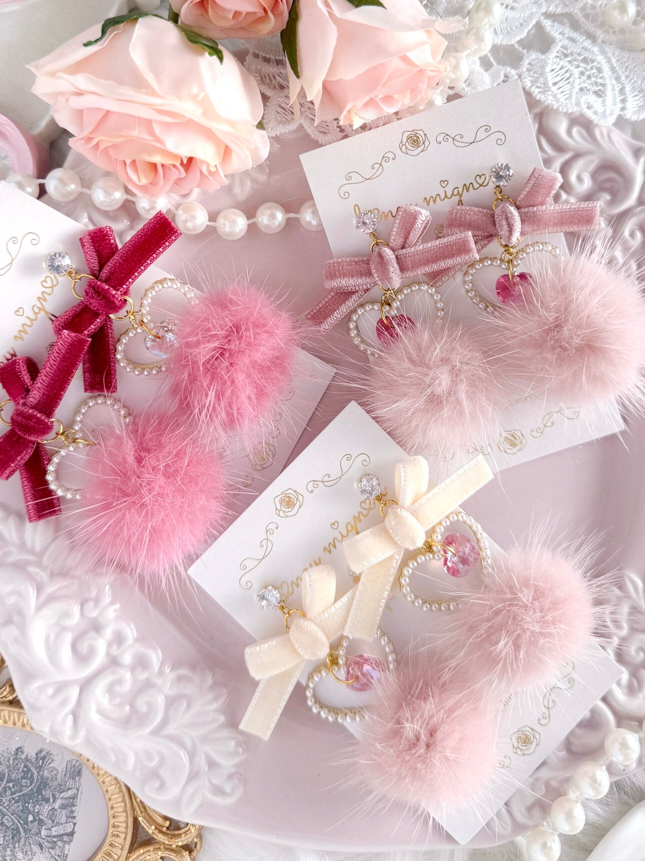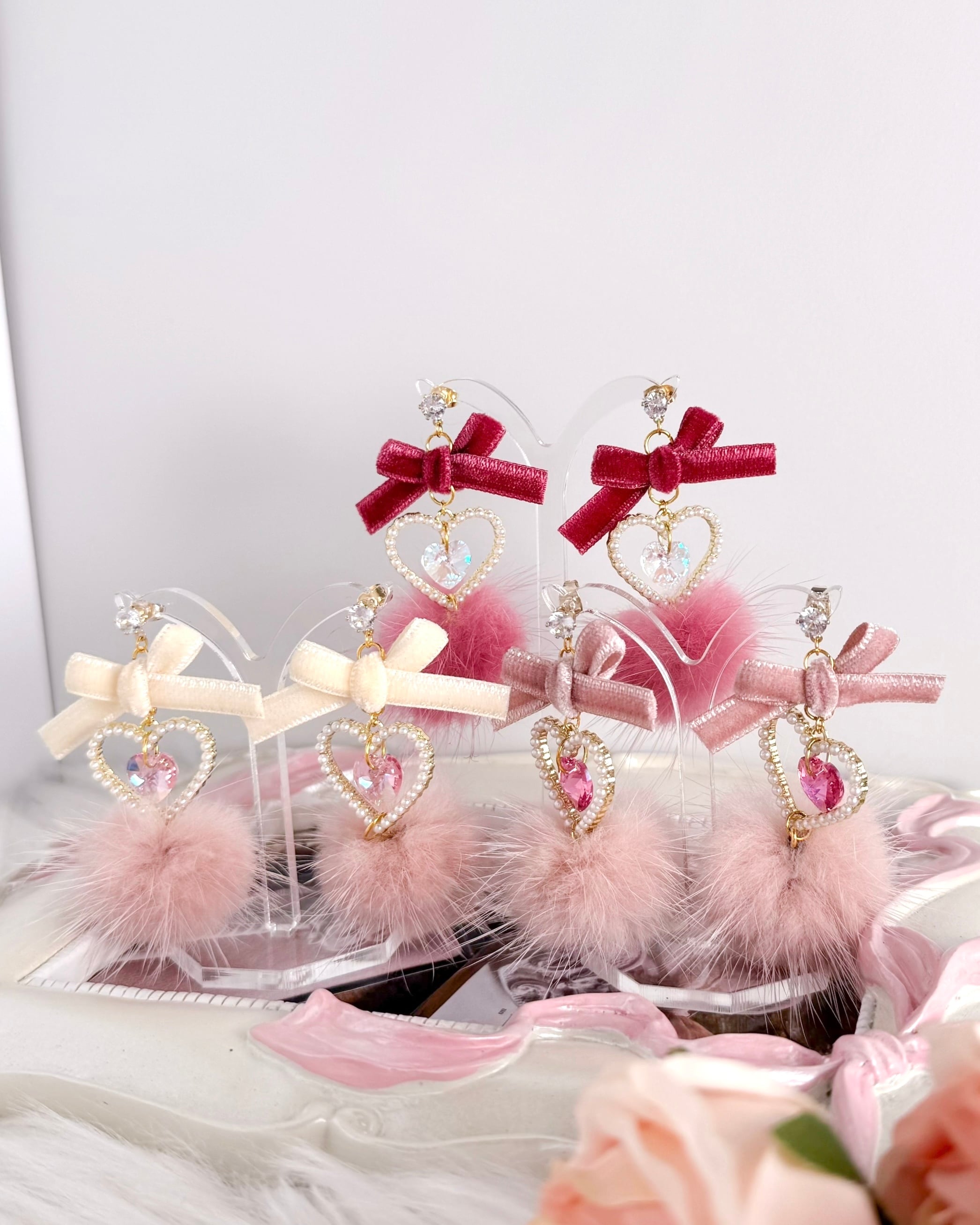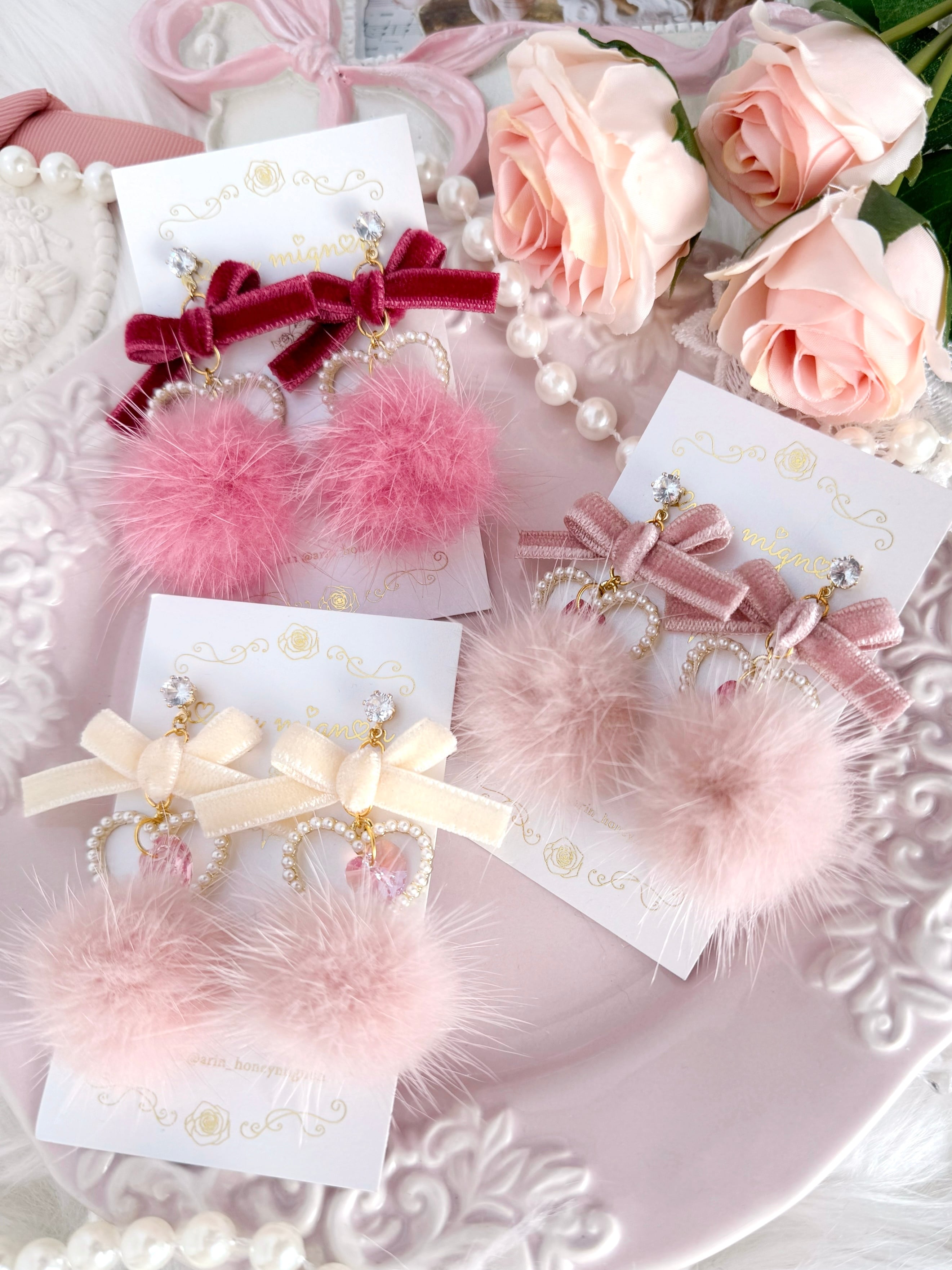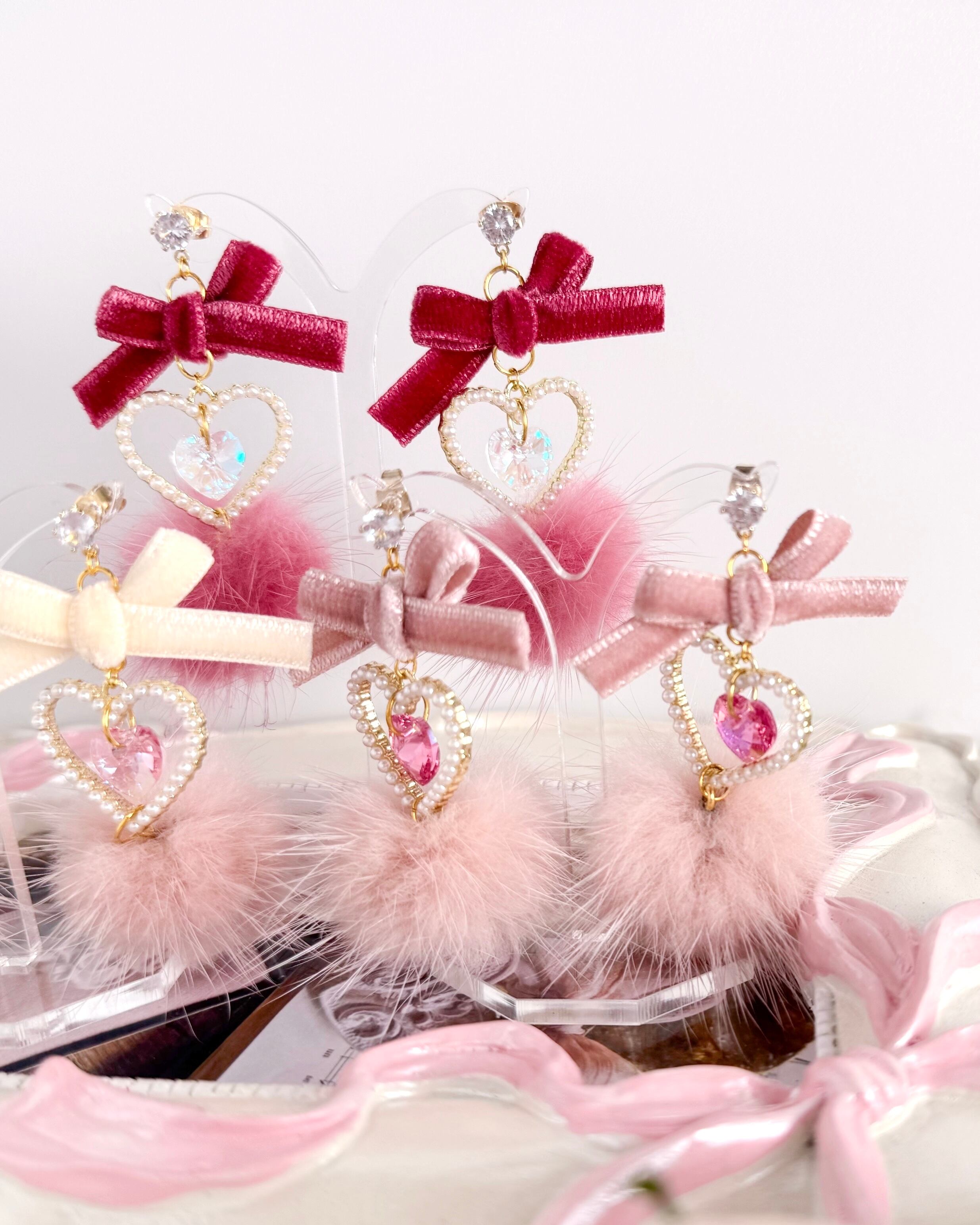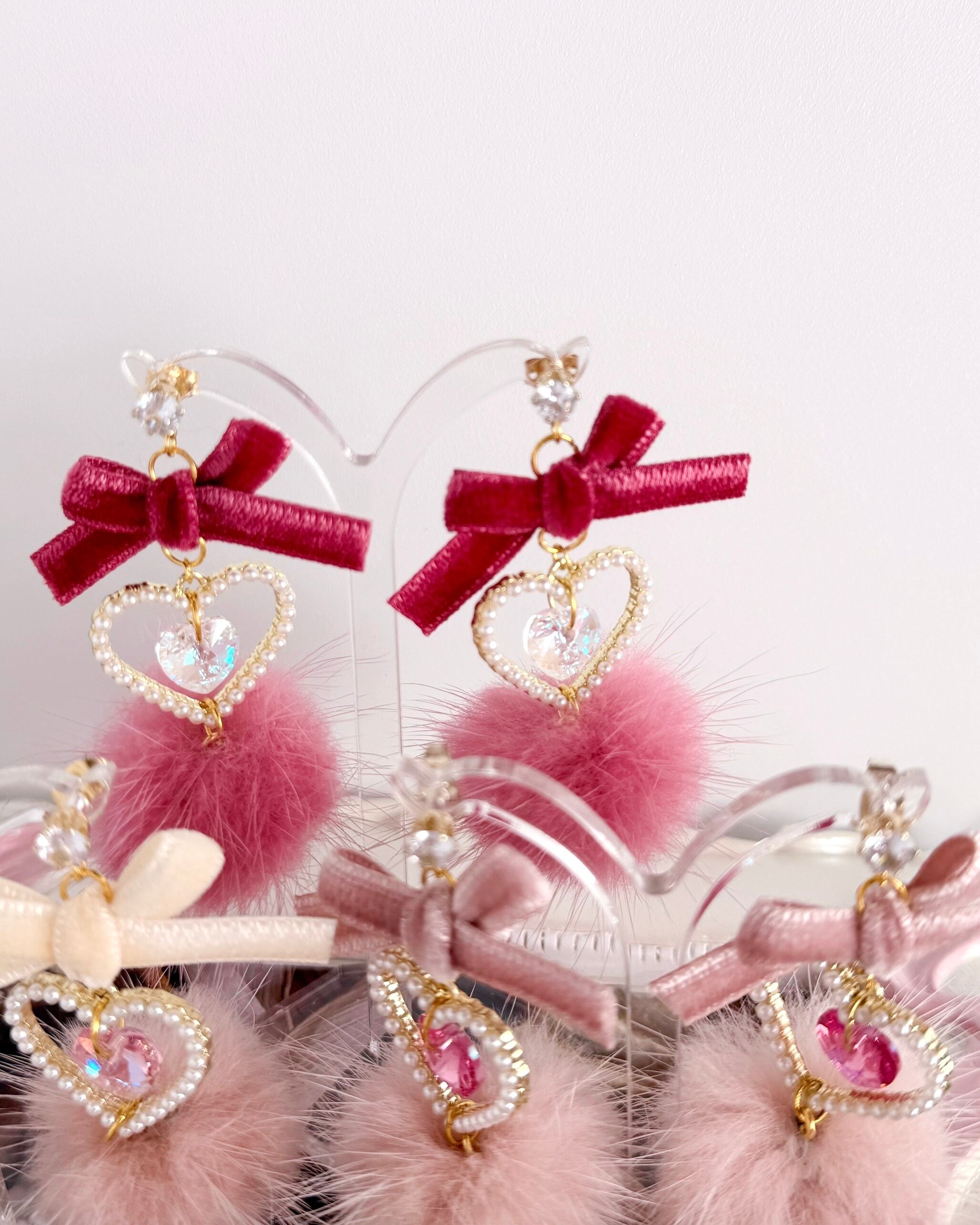 ベルベットリボンときらめくハートモチーフに、ふんわりとしたファーを合わせた耳元アクセサリー