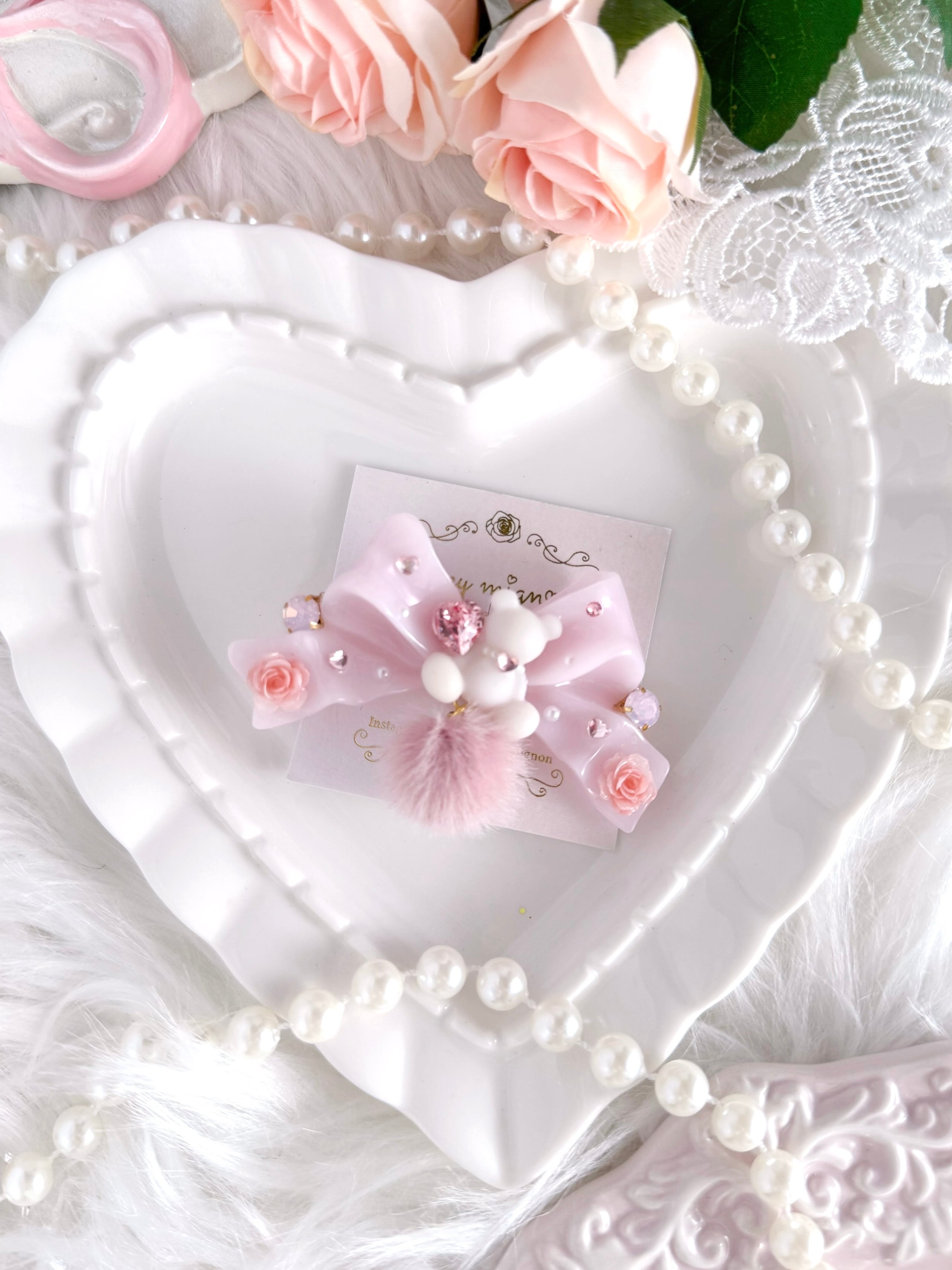 ふわふわのファーをまとったリボンモチーフに、小さなしろくまの飾りとビジューを添えた冬らしいヘアクリップ。