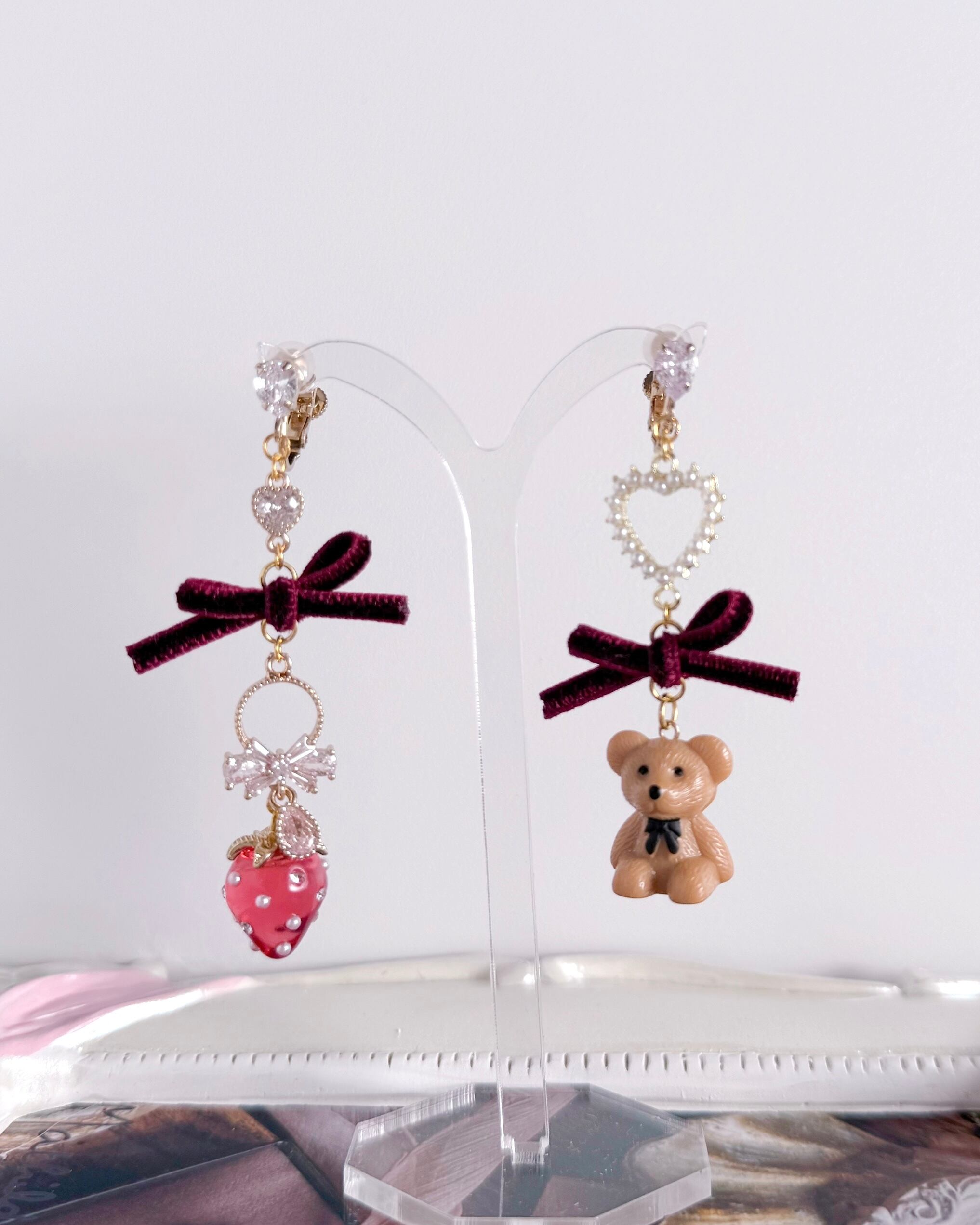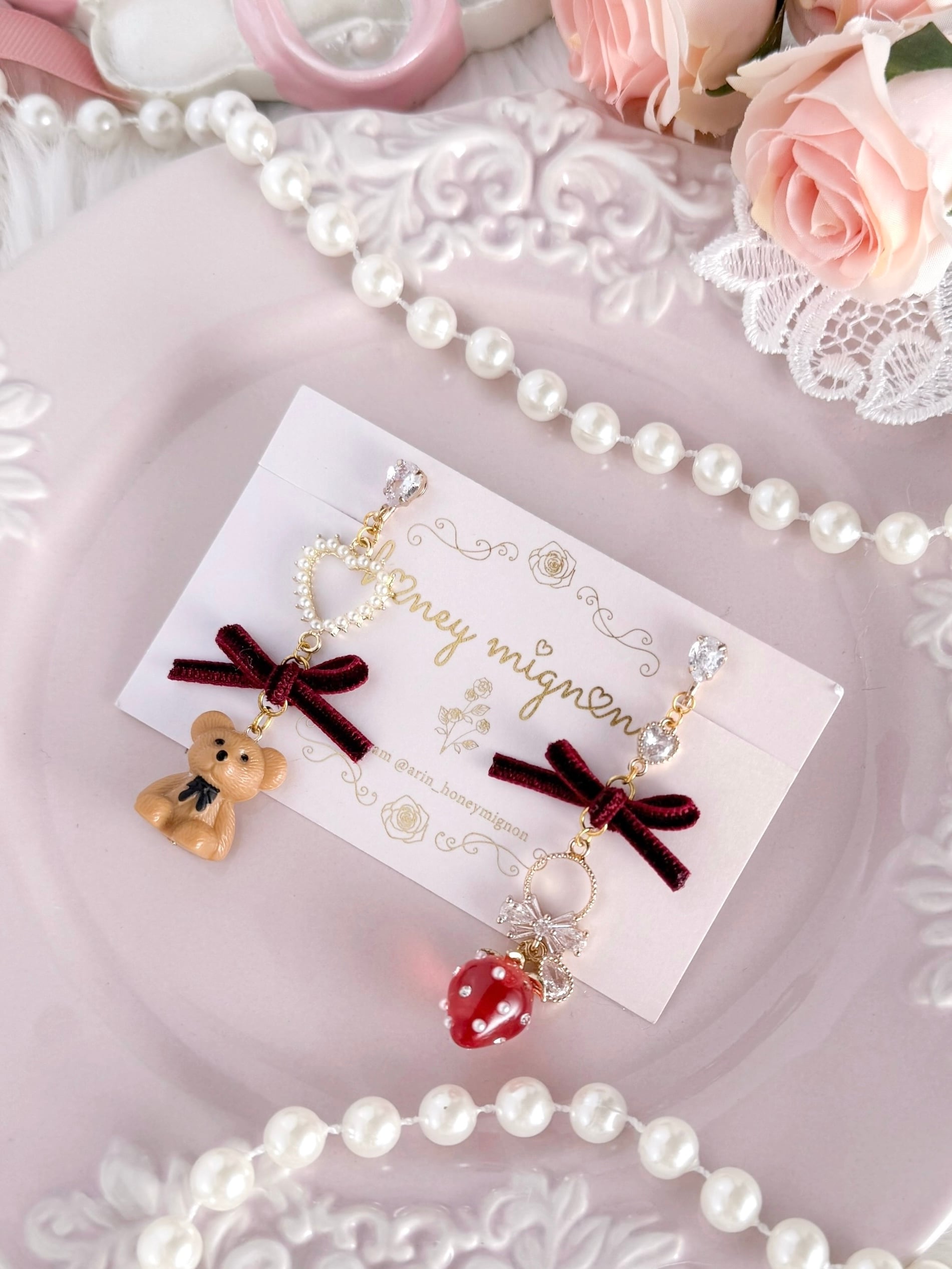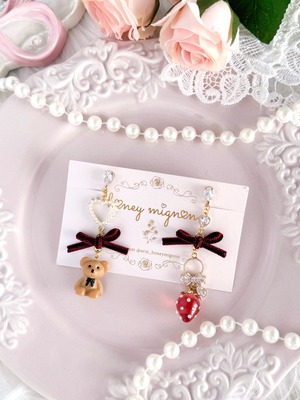 ころんとした小さなベアと、きらきら輝くいちごモチーフを組み合わせたピアス。