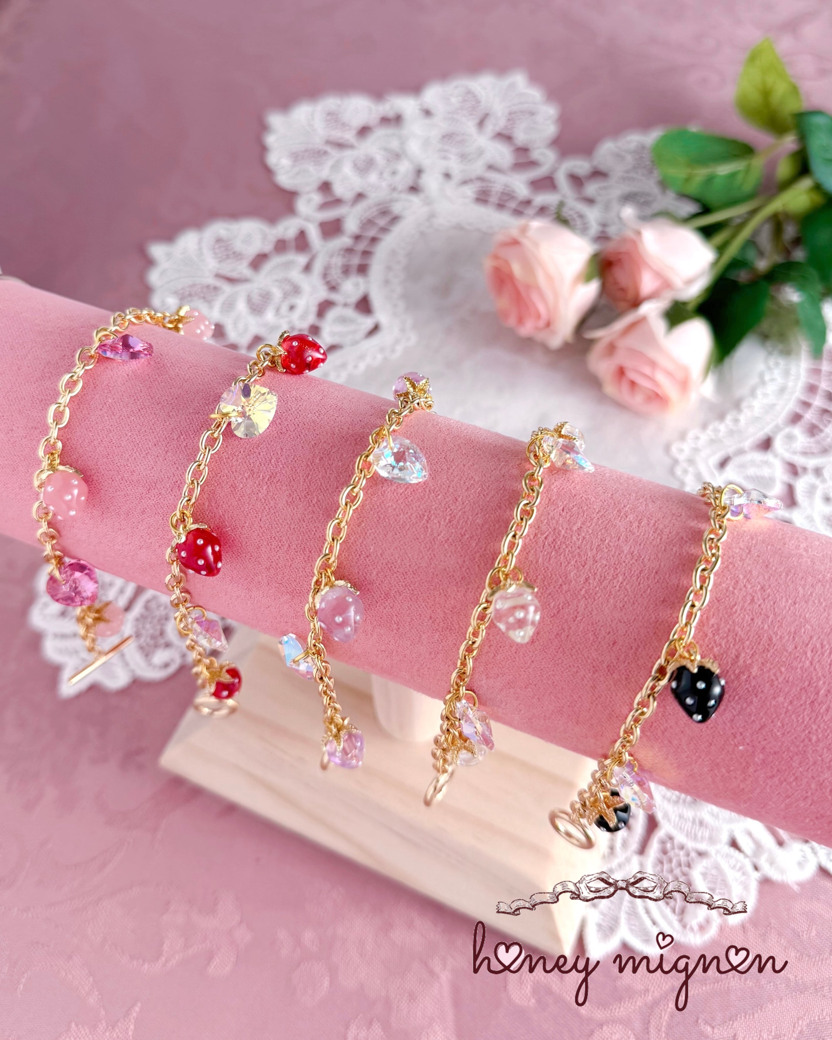 きらめくハートビジューと、小さないちごチャームを連ねたブレスレット。