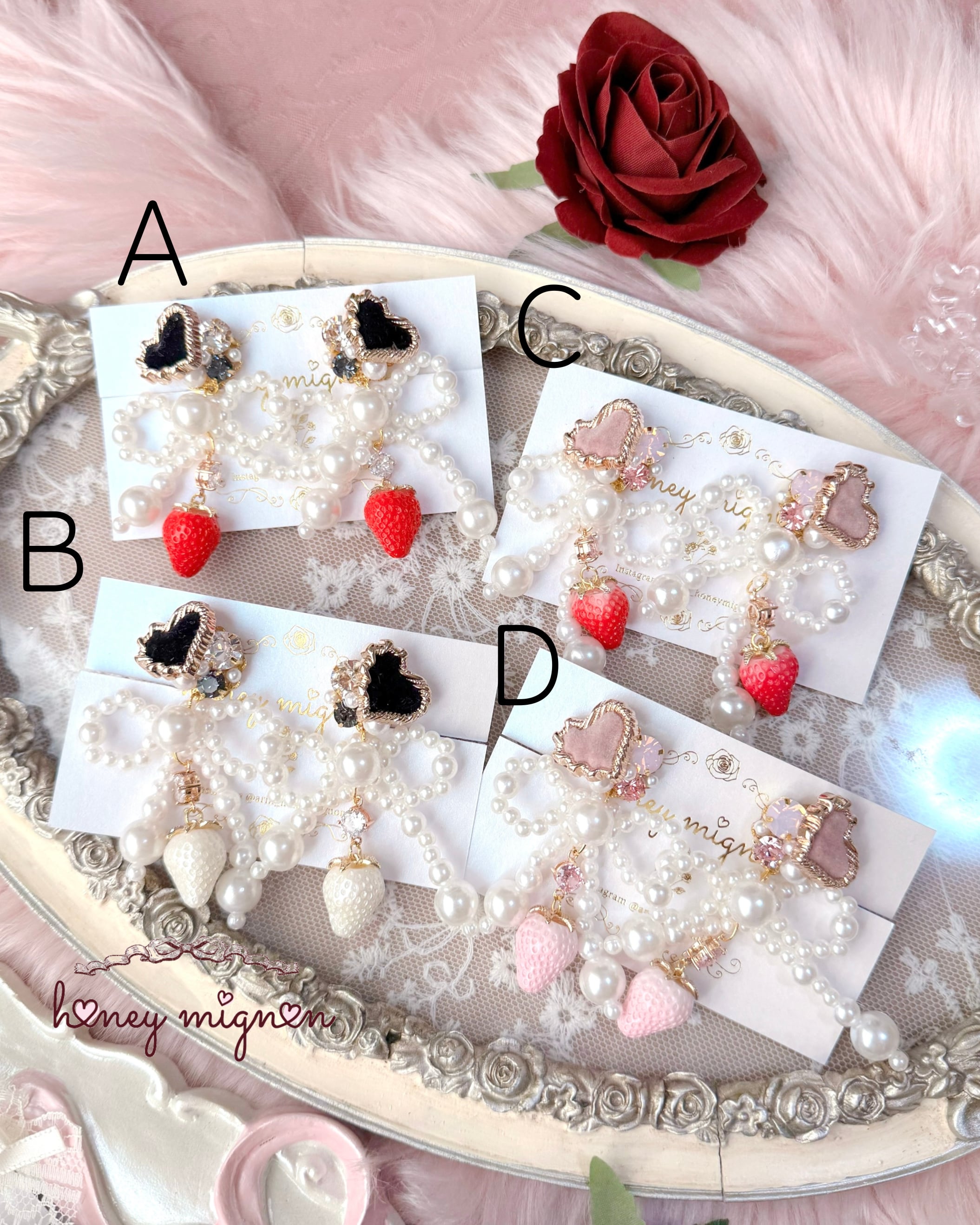 ハートモチーフとパールを重ね、揺れるいちごチャームを添えた耳元アクセサリー。