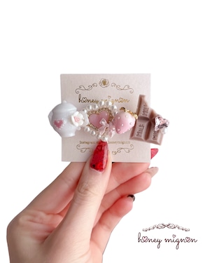 パールやリボン、チョコレート風パーツを重ね、バレンタインを思わせるロマンティックなデザインに仕上げました。