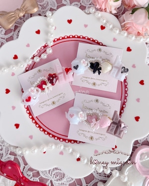 ハートやストロベリーモチーフを組み合わせた、甘い世界観が広がるヘアクリップ。