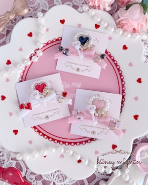 パールで縁取ったハートモチーフに、リボンやビジューを組み合わせた甘さたっぷりのヘアクリップ。
