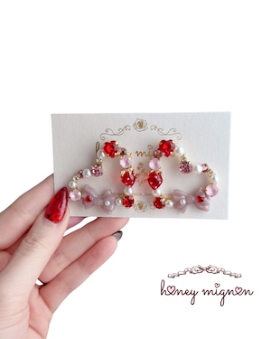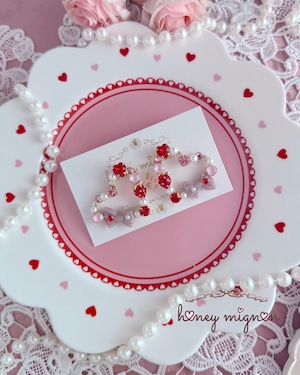 赤とピンクのストーンが描くハートラインが、甘く華やかな印象を引き立てます。
