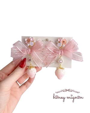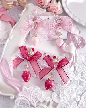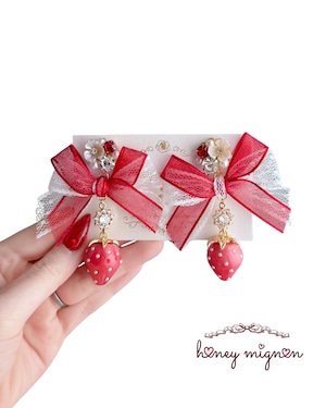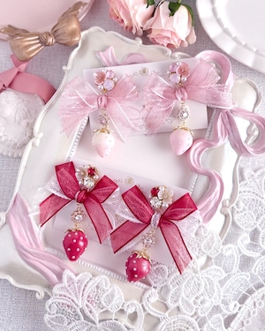 大きなチュールリボンに、愛らしいいちごモチーフを合わせたロマンティックな耳飾り。