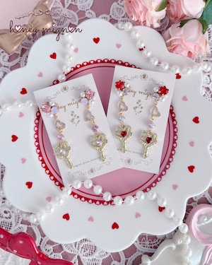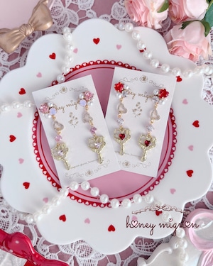 きらめくビジューとパールを連ね、ハートと鍵モチーフを組み合わせた夢あふれる耳元アクセサリー。